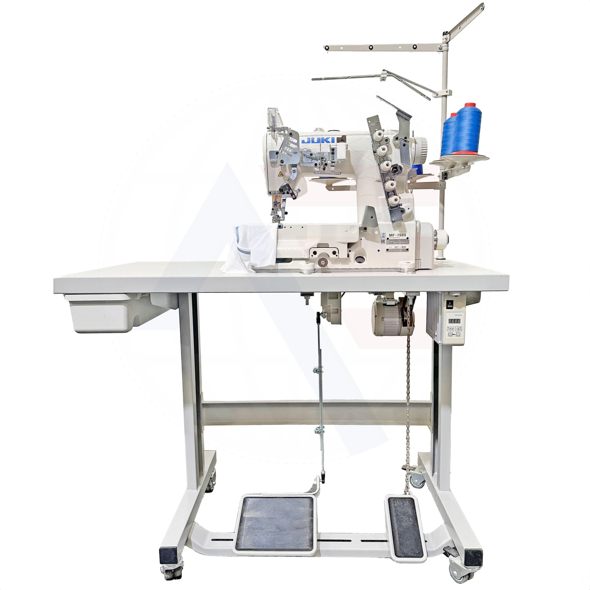 The Juki MF-7523-U11 is a high-speed, flat-bed, differential feed top and bottom coverstitch machine (universal type). It is supplied fully assembled, complete with British RU/C wheeled stand, manufacturer grade tabletop, drawer & extras. Before dispatch, everything is tested and signed off by one of our technicians so you can be sewing within minutes!