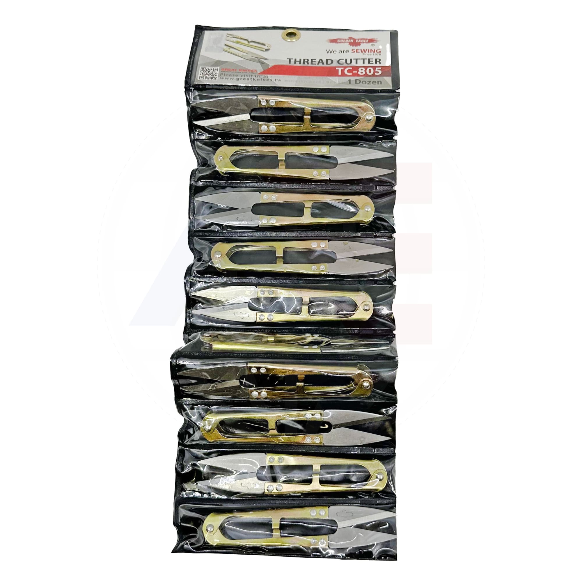 Golden Eagle TC805 stainless steel gold snips, packaged 12 pcs on a strip. These snips are perfect for trimming thread and are a handy addition to any sewing room.